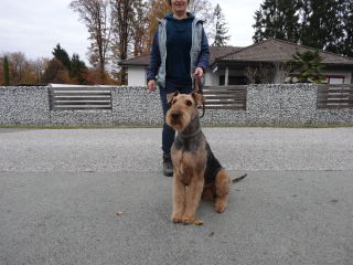 der Steiermark bei Fam. Dr. Schöll und wird der neue Freund und Begleiter vom 8-jährigen Sohn der Familie. Er wird uns dann auch regelmäßig bei unserem Training besuchen, um seinen Hund zu trainieren und auszubilden. Gleichzeitig lebt er mit Styrian Spirit Gratus Philos zusammen. Styrian Spirit Virus (rechts) verlässt uns nach Niederösterreich und wird dort neben Styrian Spirit Pumpkin, Quentin Tarantino, Rapsodia Satanica und Uriel der 5. Airedale von Frauchen Pusterhofer. Wie bereits die anderen vier von ihnen wird auch Virus im Hundesport arbeiten. Dafür wünsche ich viel Erfolg! |